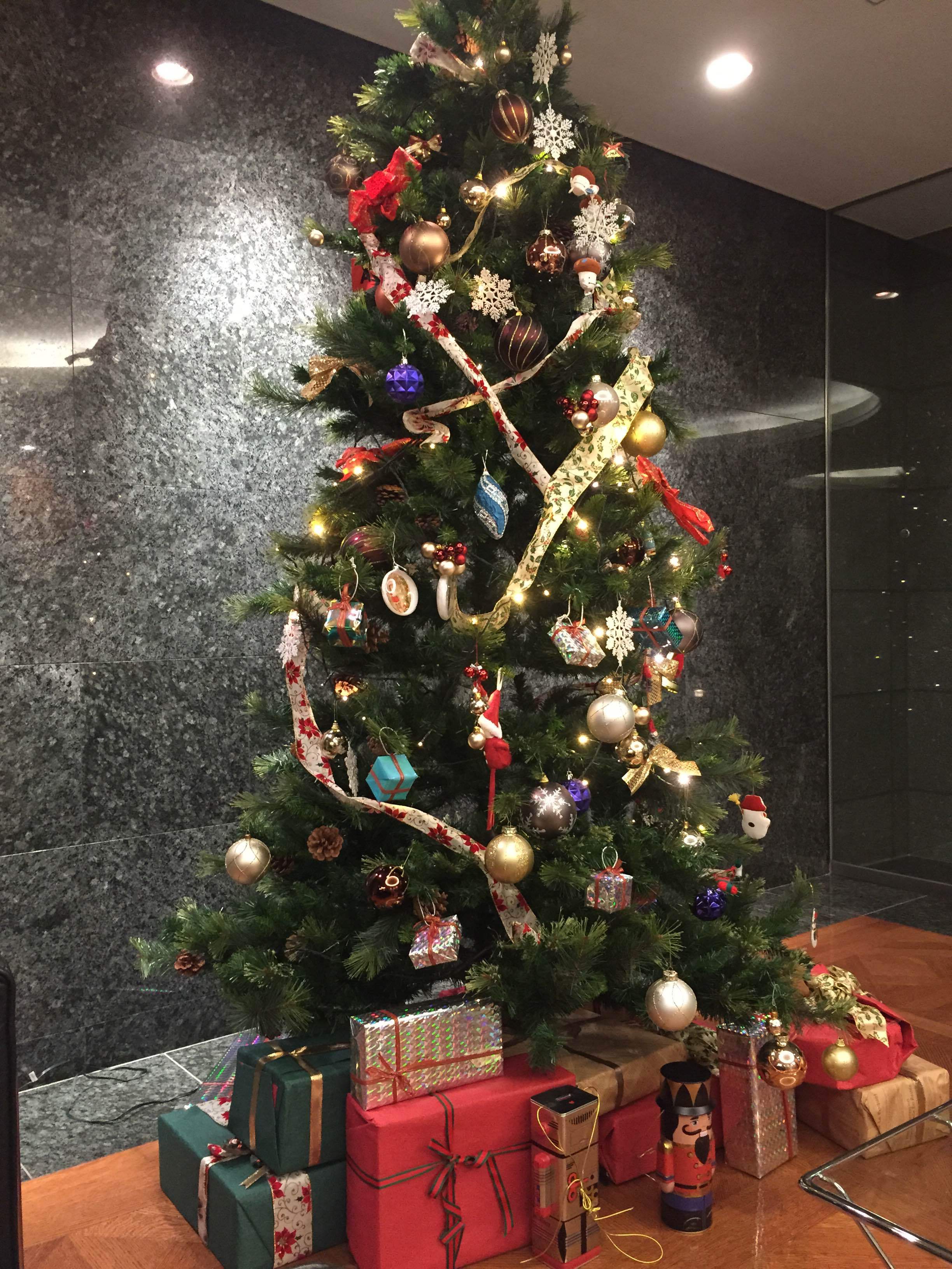 3m近くある大きなツリーに四苦八苦でなんとか今年も無事に点火。