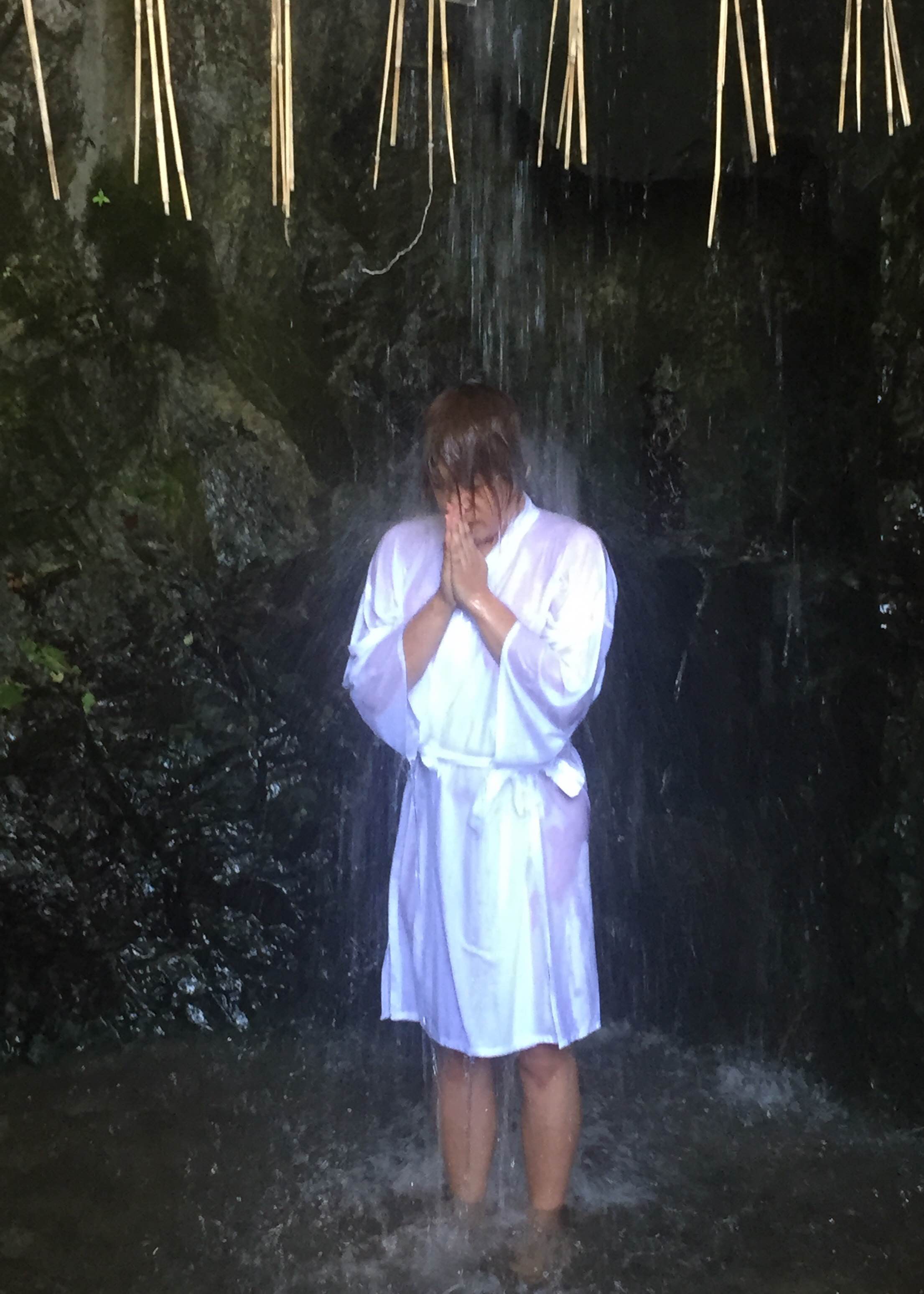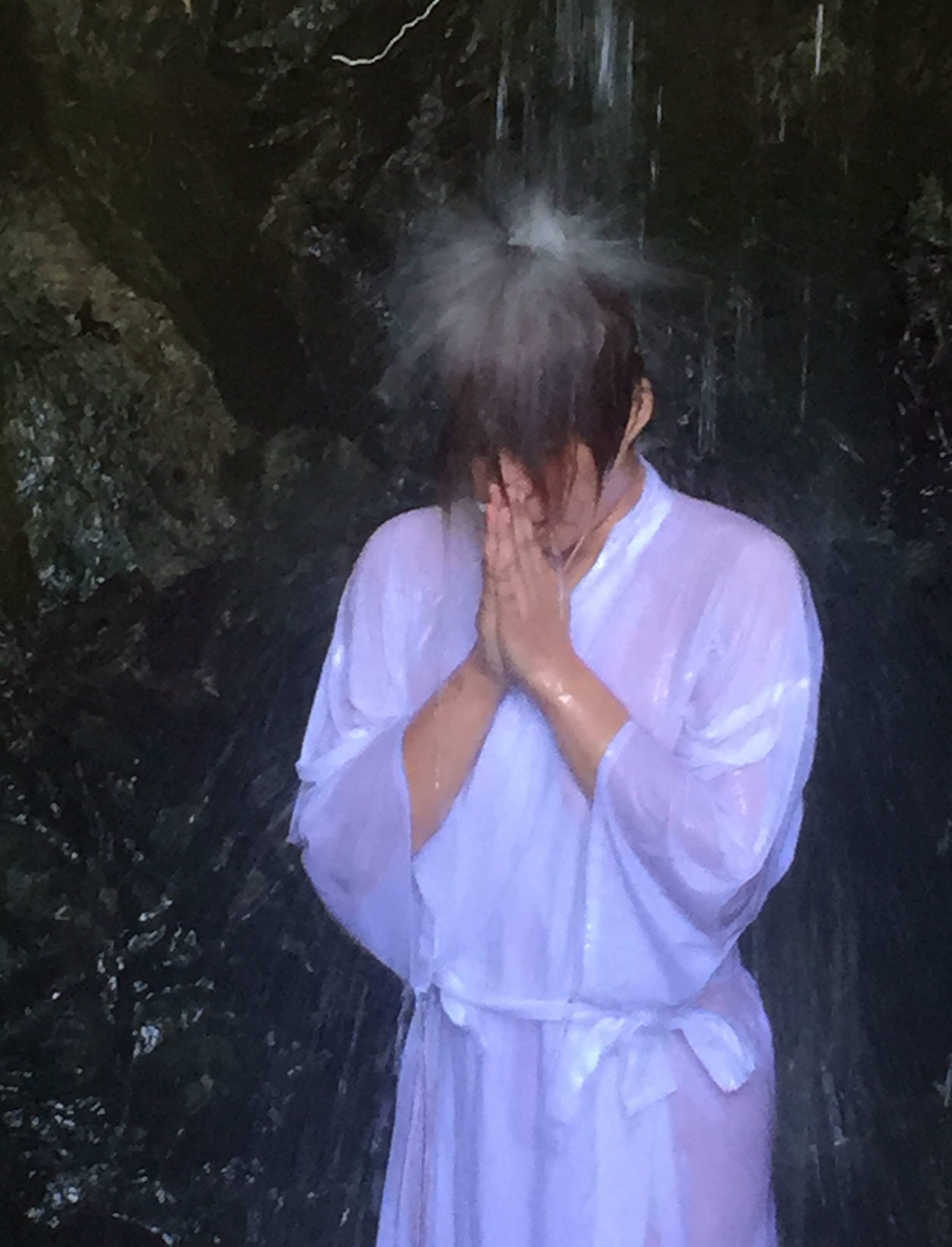 滝依に着替え、神聖な場所の滝場で禊ぎを受けます。猛暑日の本日、大阪市内は34°もあったにも関わらず、滝に打たれて出てくると、ブルブル震えるくらい寒かったです