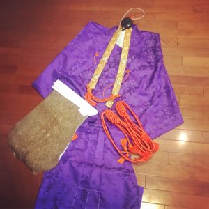 真言宗 犬鳴派の我が七寶瀧寺の女性山伏の装束は紫。男性は玉子色。他の宗派では女性も玉子色なんだけど。七寶瀧寺は紫。