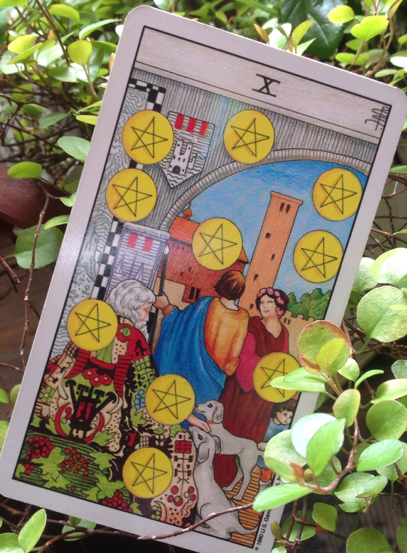 で、引いたカードはペンタクルの10。絵柄の通り 幸せな大家族という意味です。