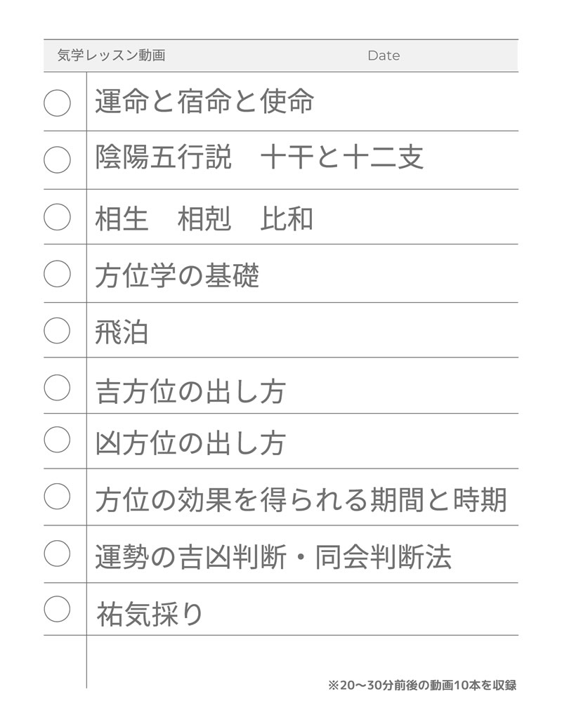 気学レッスン動画では、命・卜・相の環境学である方位術を学べます。引っ越し、新築、旅行など、移動をする際、ご自身が開運できる方位に移動することができます。運気が低迷していても、方位を知り、気をコントロールできれば必ず開運できます。